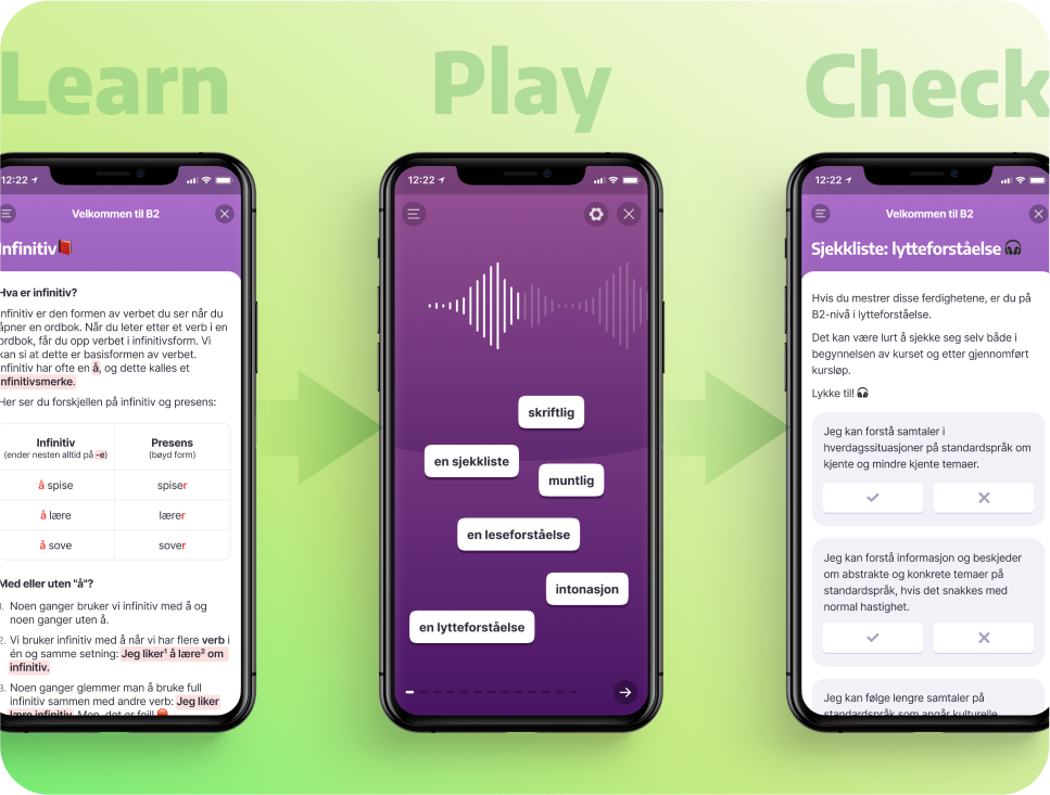 Tenga en cuenta que el programa para un solo jugador está diseñado para el aprendizaje a su propio ritmo y basado en el autoaprendizaje y, por lo tanto, no es válido para fines de residencia permanente. Tampoco podrá combinarse con otros cursos para este propósito en el futuro. Para recopilar tiempo de aprendizaje para la residencia permanente en Noruega, elija uno de los programas de aprendizaje a continuación, que sea adecuado para usted.